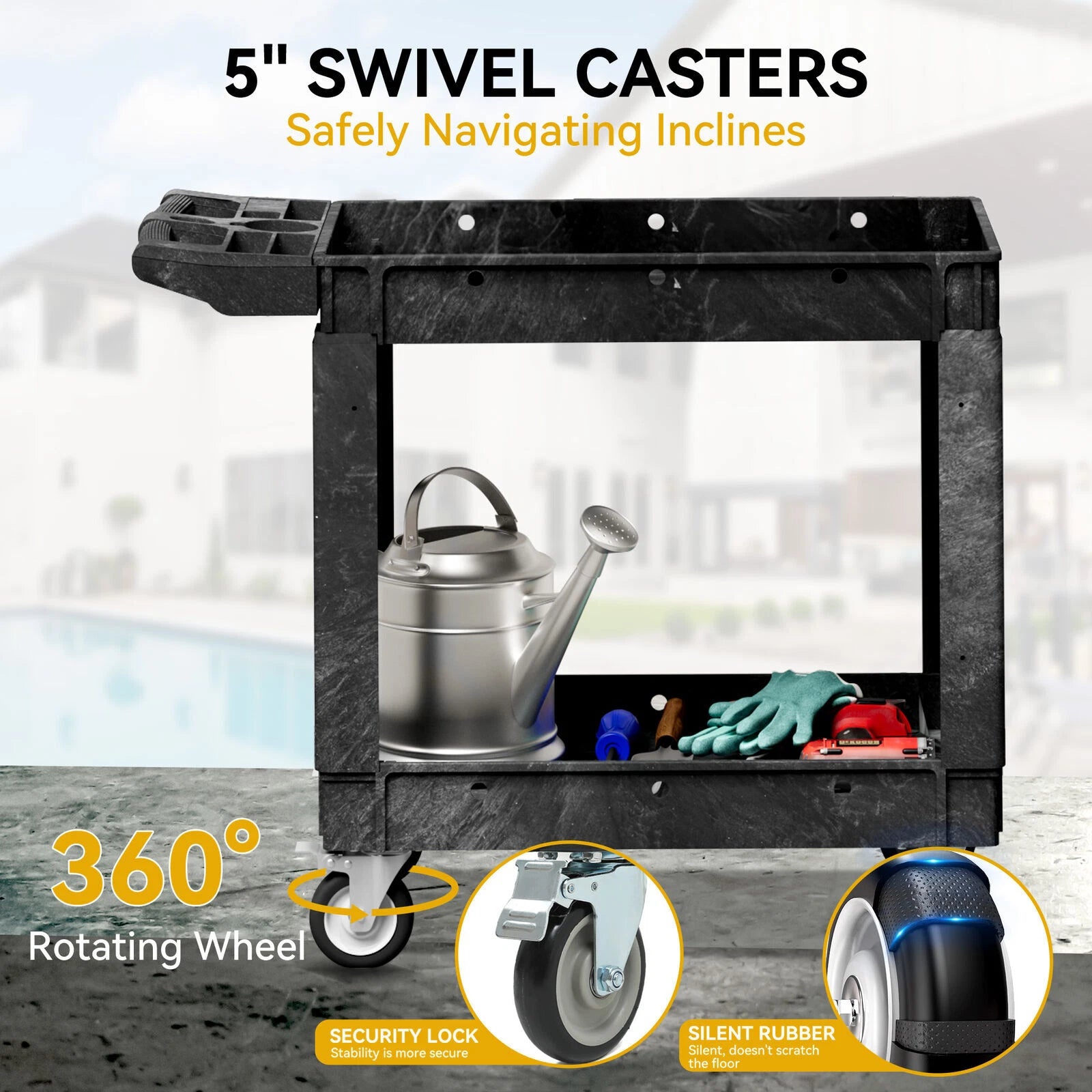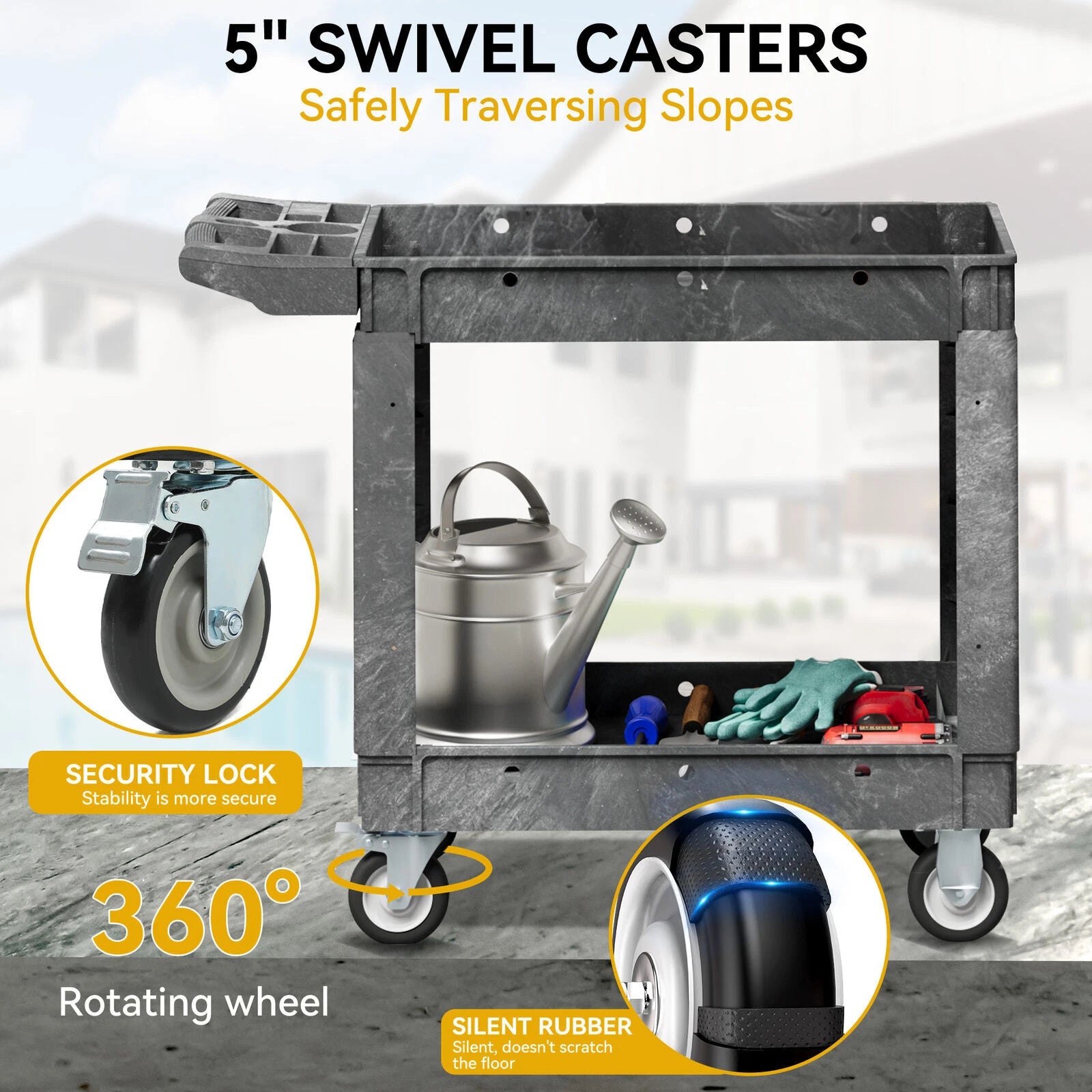 This versatile utility cart offers a robust weight capacity of up to 550 lbs and features a spacious dual-layer structure designed for maximum efficiency. Equipped with durable 5-inch swivel casters, this cart ensures smooth and easy movement, whether you're transporting goods around a warehouse, office, or workspace. Its lightweight, portable design allows for effortless relocation, enabling you to adapt the cart to your specific needs.