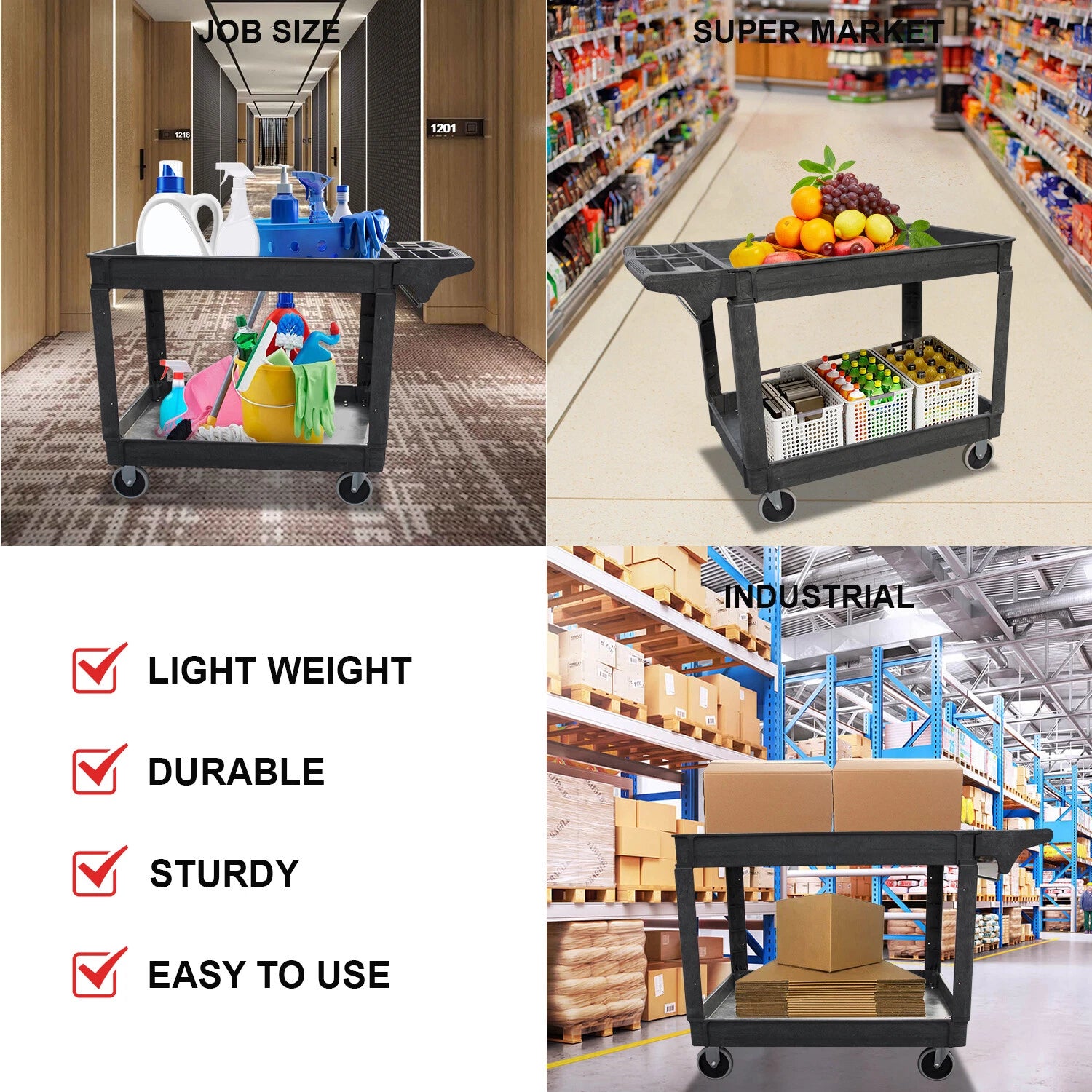With its combination of durability, mobility, and large weight capacity, this utility cart is perfect for heavy-duty tasks. Order now and enjoy the convenience of an easy-to-assemble, efficient solution for your daily work!