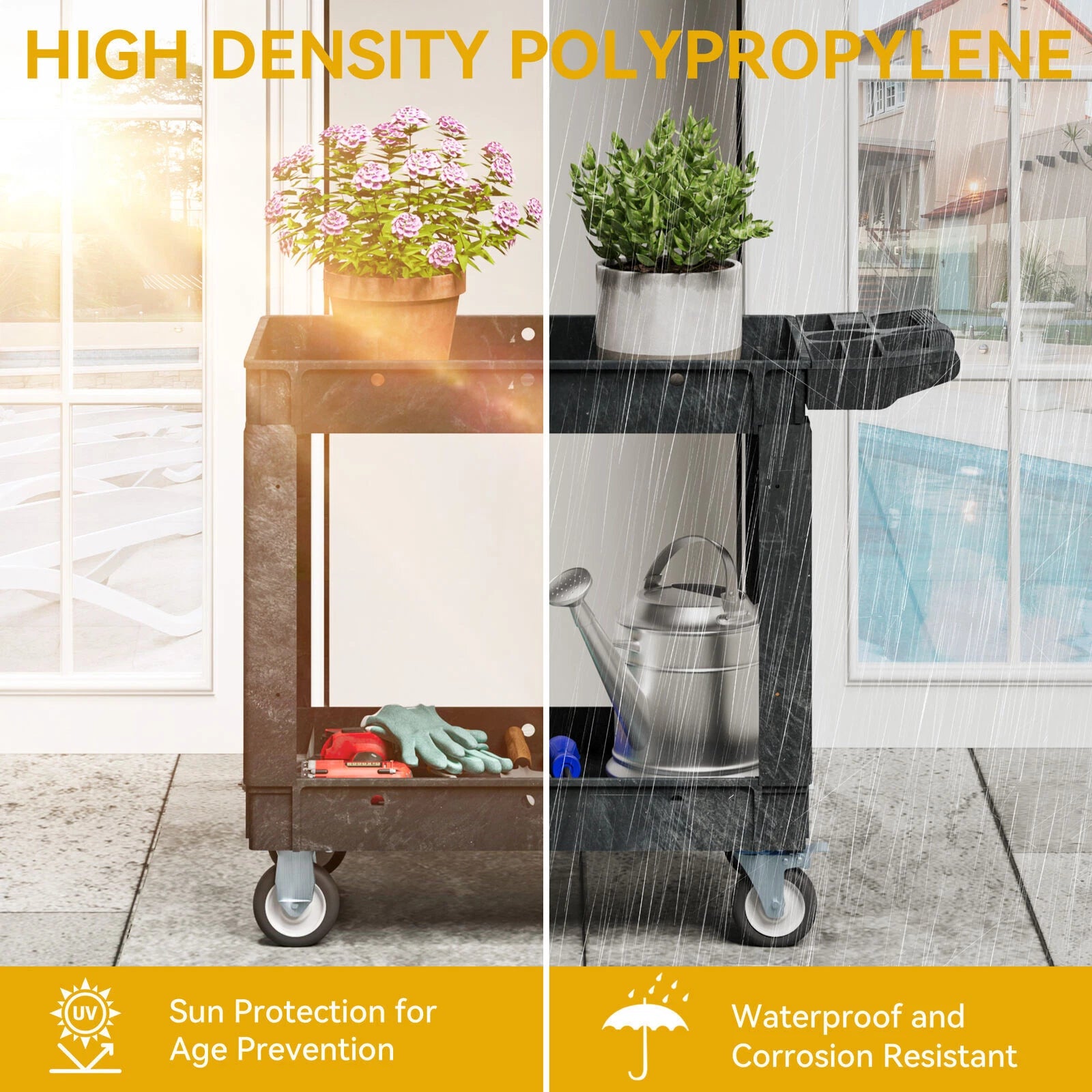 Durable Construction: Made from high-quality polypropylene, the cart is weather-resistant, waterproof, and built to withstand daily use.