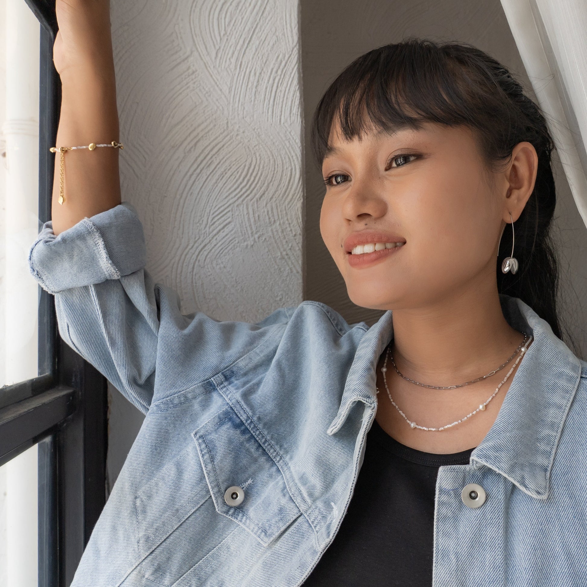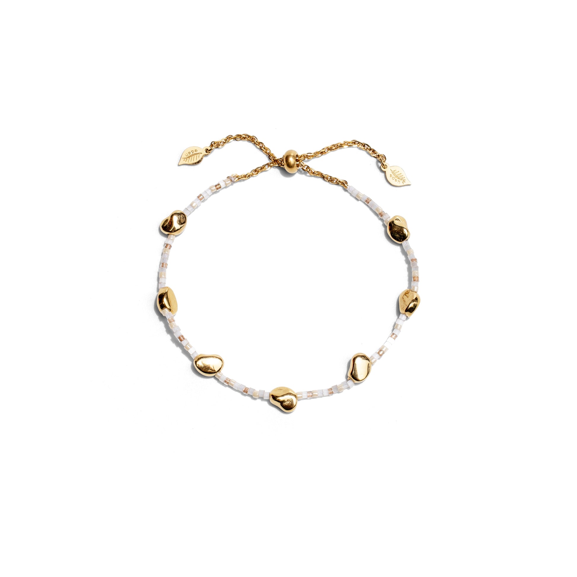 This pull-tie chain bracelet features hand-strung glass beads and is accented with seed-like 18K gold-plated stainless steel beads. The adjustable rope chain ensures a perfect fit, tightening to 6.25” and extending up to 10”.